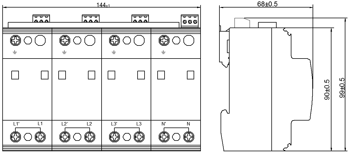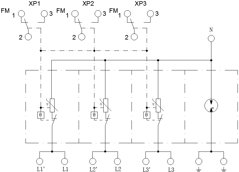 This series is used for primary and secondary surge protection. The 3+1 and 1+1 configurations are composed of MOV and GDT power module for L-N, N-PE protection respectively. The 4+0 and 2+0 configurations are composed of MOV power module for L-PE, N-PE protection. It is applied in low voltage AC power distribution system, and connected between the AC power supply and the equipment in parallel. It can prevent the equipment from the impulse surge and the transient overvoltage caused by the outside environment (such as lightning, EMI, etc.) or by the system (such as switching effects of the system, startup or shutoff of the inductance and capacitance load, etc.).
