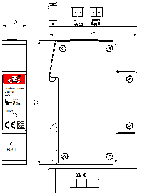 ZGQ-11 雷击计数器的电感探头安装在雷电流通过的导线上(一般为地线),当雷电流到来一次,电感探头采集雷电电流信号,将电流信号转化为电压信号,经信号处理送入单片机,记录一次雷电流,并将该雷电流计数信号通过干接点传输至用户,且该信号保持时间≥500ms。